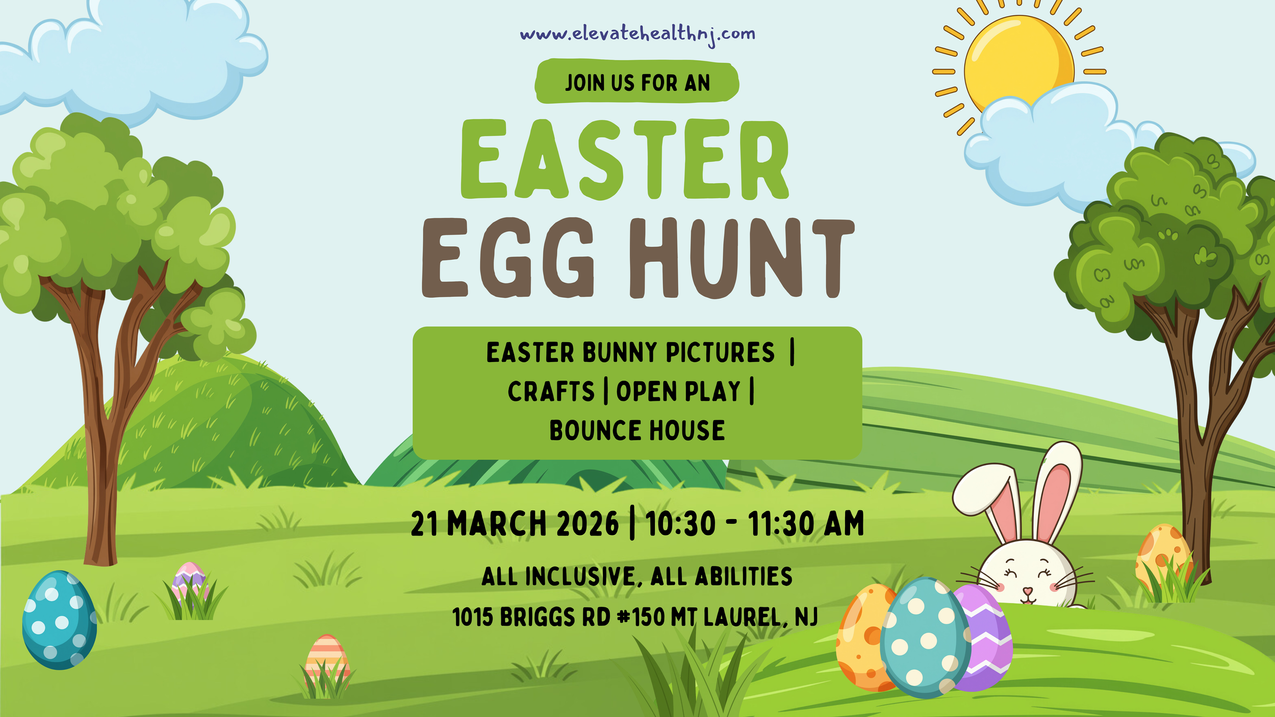 Beyond the hunt, there is so much to explore! Families can visit the Easter Bunny for photos (don't forget your camera!), get creative in our two craft rooms, or enjoy some quiet time in our Reading Room. For those with extra energy, our OT and ABA spaces will feature a Bounce House and open play area. If anyone needs a break from the excitement, a dedicated Quiet Room is available at any time.